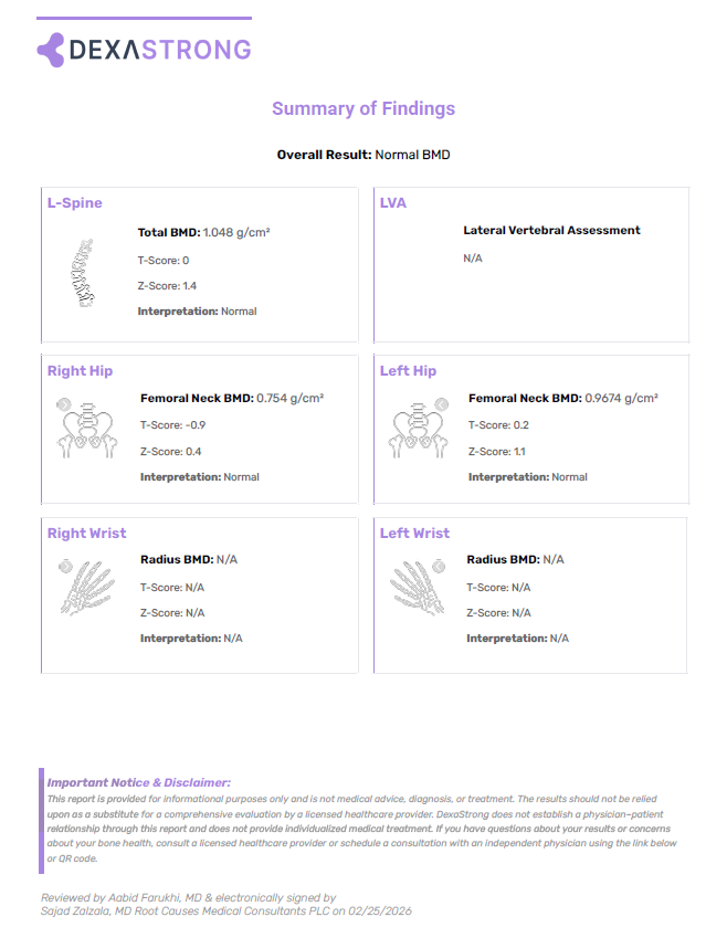 With DexaStrong, your bone density results go beyond numbers. Every scan is reviewed by a licensed radiologist, and you receive a clear, easy-to-read report with professional insights.